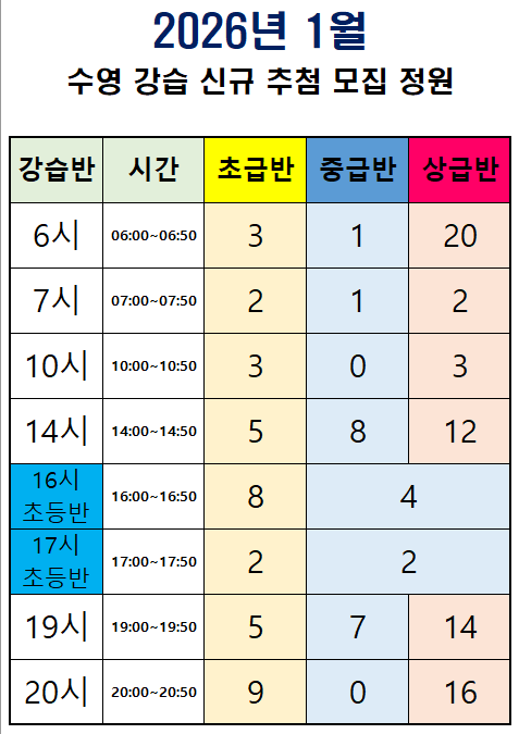 1월 수영강습 신규 접수 기간 : 12월 18일 ~ 12월 21일 (20시까지 방문 접수)
