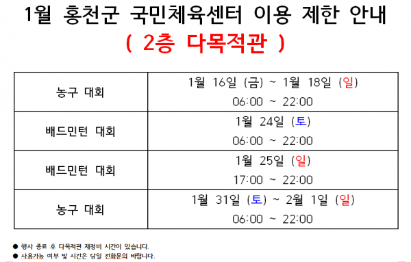 2026년 1월 다목적 체육관 이용안내 (1/8수정) 페이지 정보 작성자 관리자 작성일26-01-02 14:35 조회173회 관련링크 다음글 목록 본문 문의 : 033-436-7330 다음글 목록