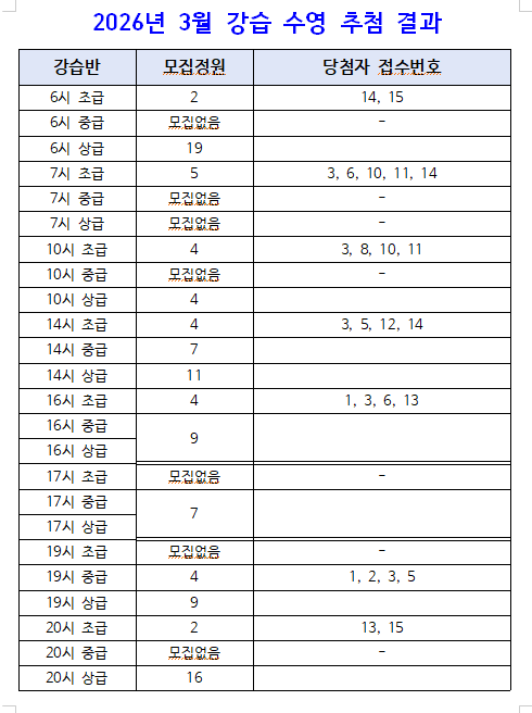 2026년 3월 수영강습 추첨 결과