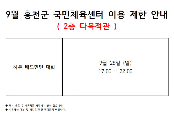 2025년 9월 다목적 체육관 이용안내 (9/26수정) 페이지 정보 작성자 관리자 작성일25-09-02 14:03 조회751회 관련링크 이전글 다음글 목록 본문 문의 : 033-436-7330 이전글 다음글 목록