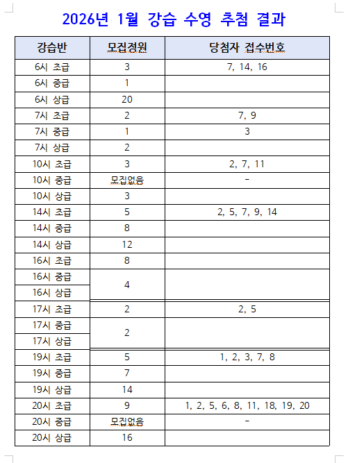 2026년 1월 수영강습 추첨 결과