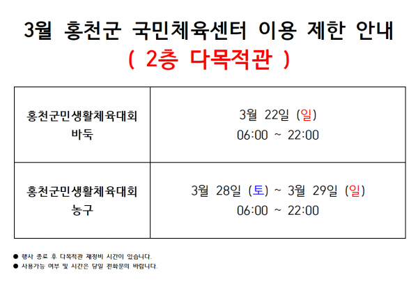 2026년 3월 다목적 체육관 이용안내 페이지 정보 작성자 관리자 작성일26-02-26 13:20 조회188회 관련링크 다음글 목록 본문 문의 : 033-436-7330 다음글 목록