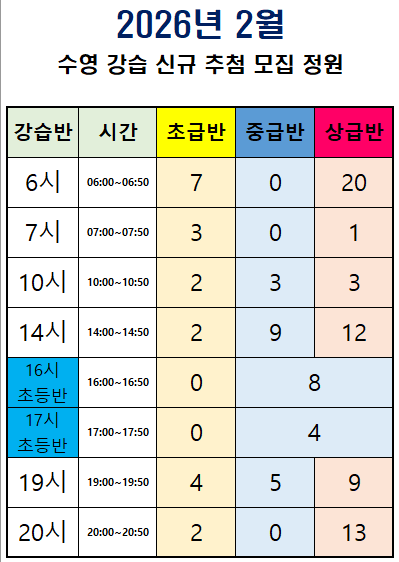 2월 수영강습 신규 접수 기간 : 1월 18일 ~ 1월 21일 (20시까지 방문 접수)