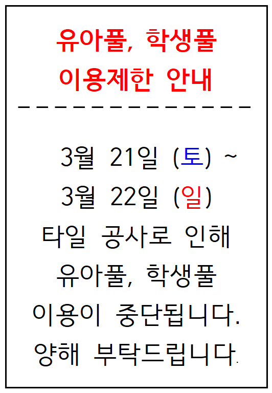 유아풀 학생풀 이용 제한 안내 페이지 정보 작성자 관리자 작성일26-03-20 16:03 조회84회 관련링크 이전글 다음글 목록 본문 문의 : 033-436-7330 이전글 다음글 목록