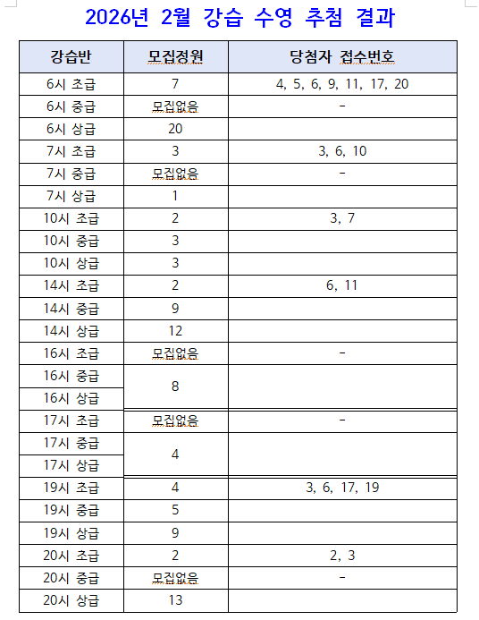 2026년 2월 수영강습 추첨 결과