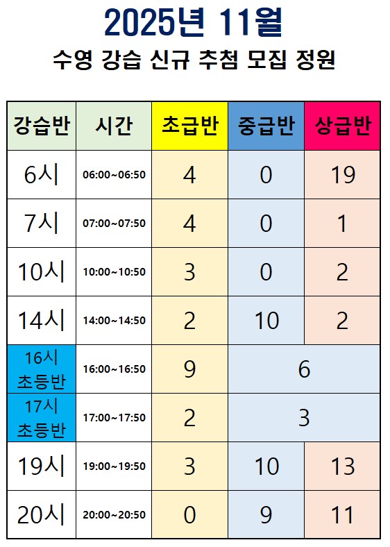 11월 수영강습 신규 접수 기간 : 10월 18일 ~ 10월 21일 (20시까지 방문 접수)