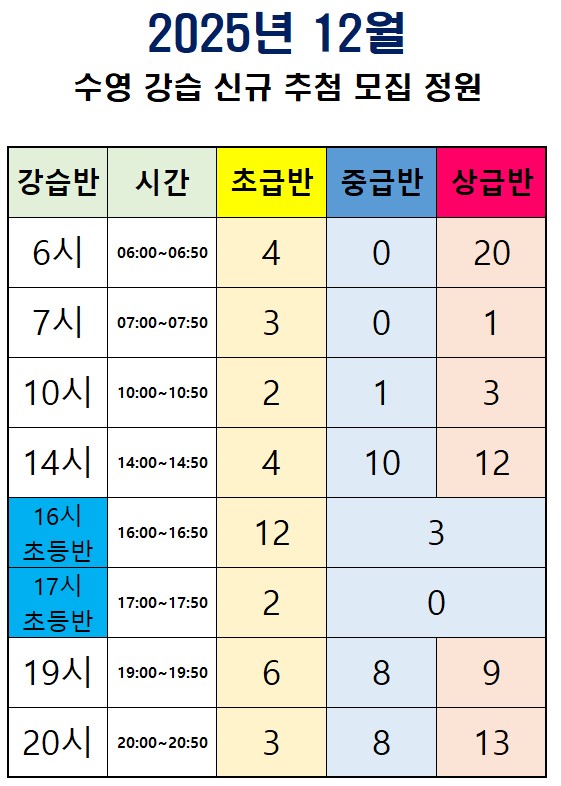 12월 수영강습 신규 접수 기간 : 11월 18일 ~ 11월 21일 (20시까지 방문 접수)