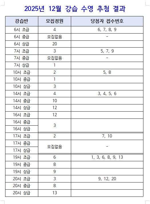2025년 12월 수영강습 추첨 결과