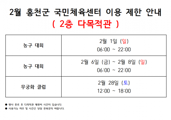 2026년 2월 다목적 체육관 이용안내 페이지 정보 작성자 관리자 작성일26-01-29 12:53 조회337회 관련링크 이전글 다음글 목록 본문 문의 : 033-436-7330 이전글 다음글 목록