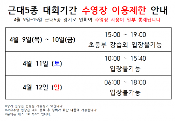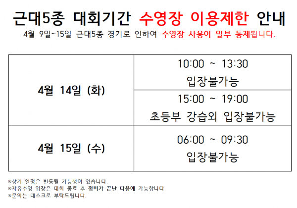 2026년 4월 근대5종 수영장 이용안내 페이지 정보 작성자 관리자 작성일26-03-31 10:19 조회43회 관련링크 다음글 목록 본문 ※자유수영 및 강습 입장은 대회 종료 후 정비가 끝난 다음에 가능합니다. ※문의는 데스크로 부탁드립니다. 다음글 목록